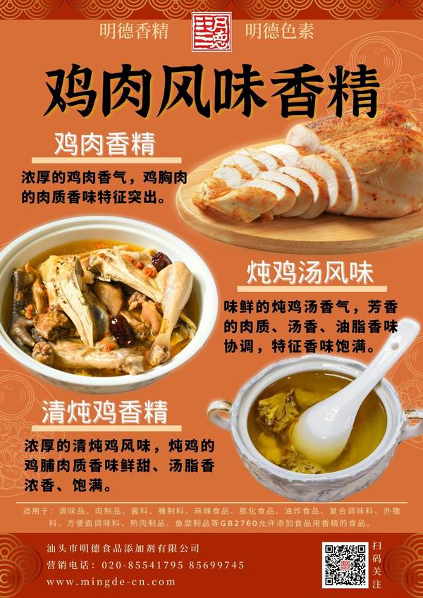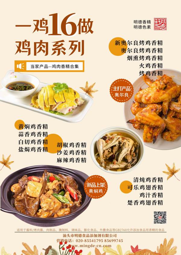在雞肉香精領(lǐng)域我們潛心專研,結(jié)合市場潮流,消費者喜好,汕頭市明德食品添加劑有限公司現(xiàn)有以下16種雞肉相關(guān)風味的香精,供您選擇。并持續(xù)努力研發(fā)更多符合市場需求的風味。